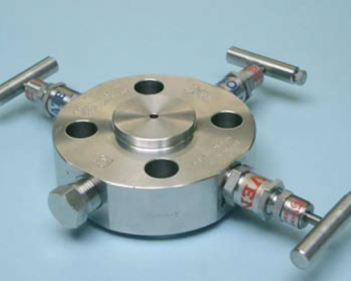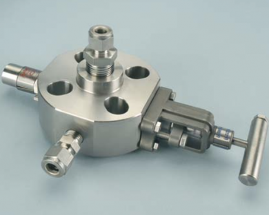 Block and bleed monoflange valve with full flange options, suitable for horizontal or vertical mounting.